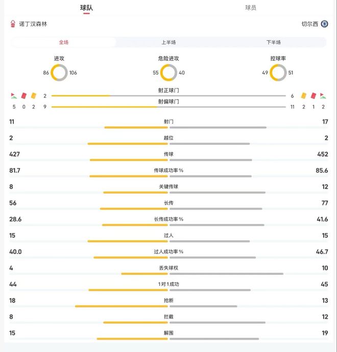 诺丁汉森林vs切尔西全场数据:射门11-17,控球率五五开